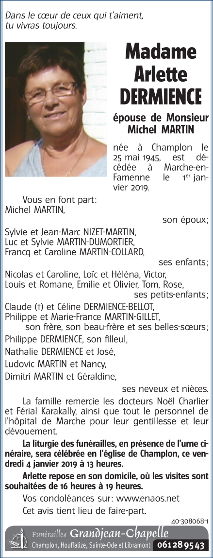 Décédée à Marche-en-Famenne (6900) le mardi 1 janvier 2019 à l'âge de 73 ans