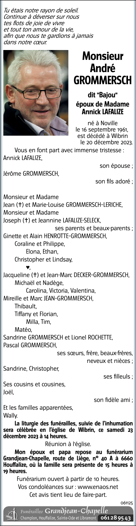 Décédé à Wibrin (6666) le mercredi 20 décembre 2023 à l'âge de 62 ans