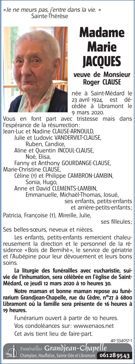 Décédée à Libramont (6800) le lundi 9 mars 2020 à l'âge de 95 ans