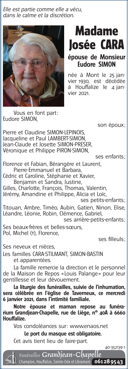 Décédée à Houffalize (6660) le lundi 4 janvier 2021 à l'âge de 90 ans
