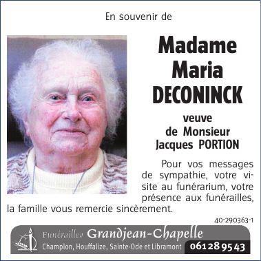 Décédée à Libramont (6800) le lundi 12 mars 2018 à l'âge de 91 ans