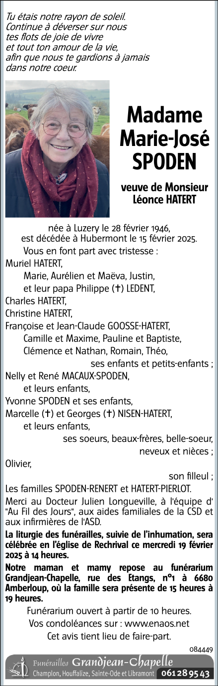 Décédée à Hubermont (6680) le samedi 15 février 2025 à l'âge de 78 ans