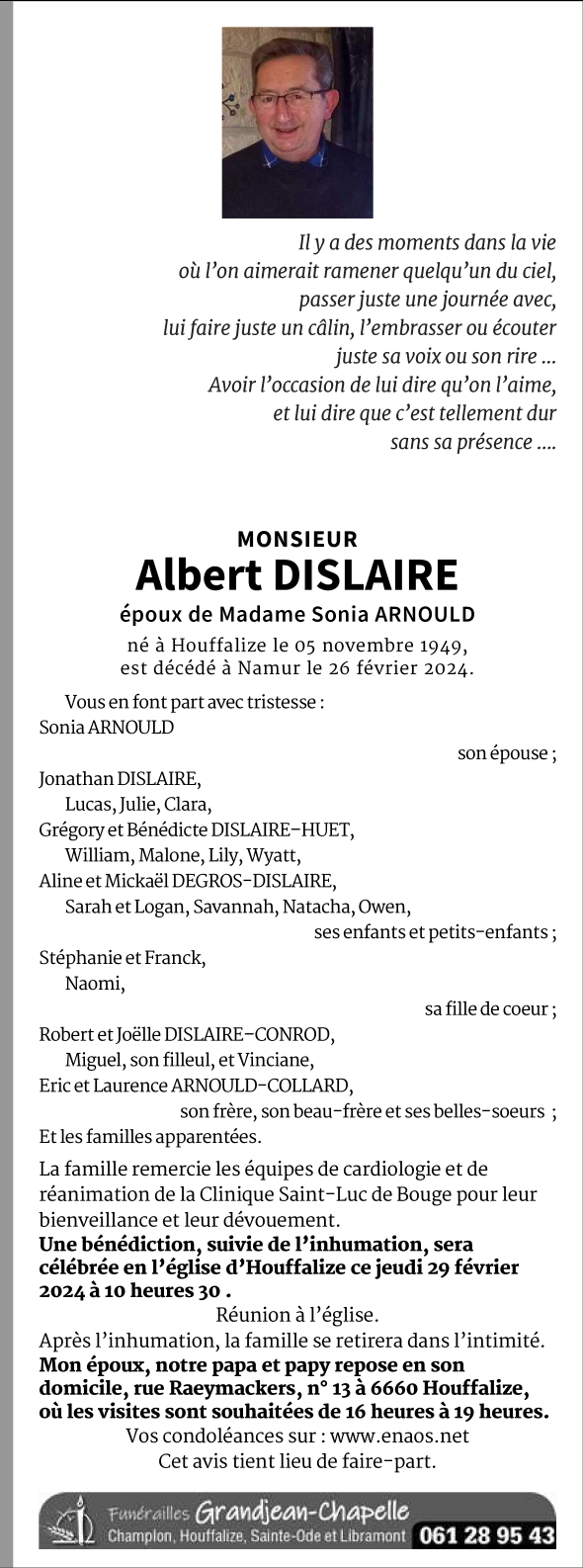 Décédé à Namur (5000) le lundi 26 février 2024 à l'âge de 74 ans