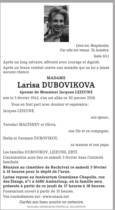 Décédée à Amberloup (6680) le mardi 30 janvier 2018 à l'âge de 55 ans