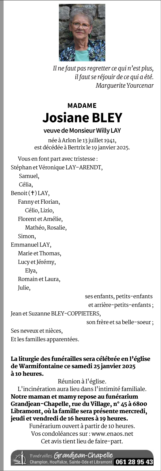 Décédée à Bertrix (6880) le dimanche 19 janvier 2025 à l'âge de 83 ans