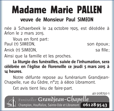 Décédée à Arlon (6700) le lundi 2 mars 2015 à l'âge de 89 ans