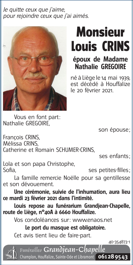 Décédé à Houffalize (6660) le samedi 20 février 2021 à l'âge de 81 ans
