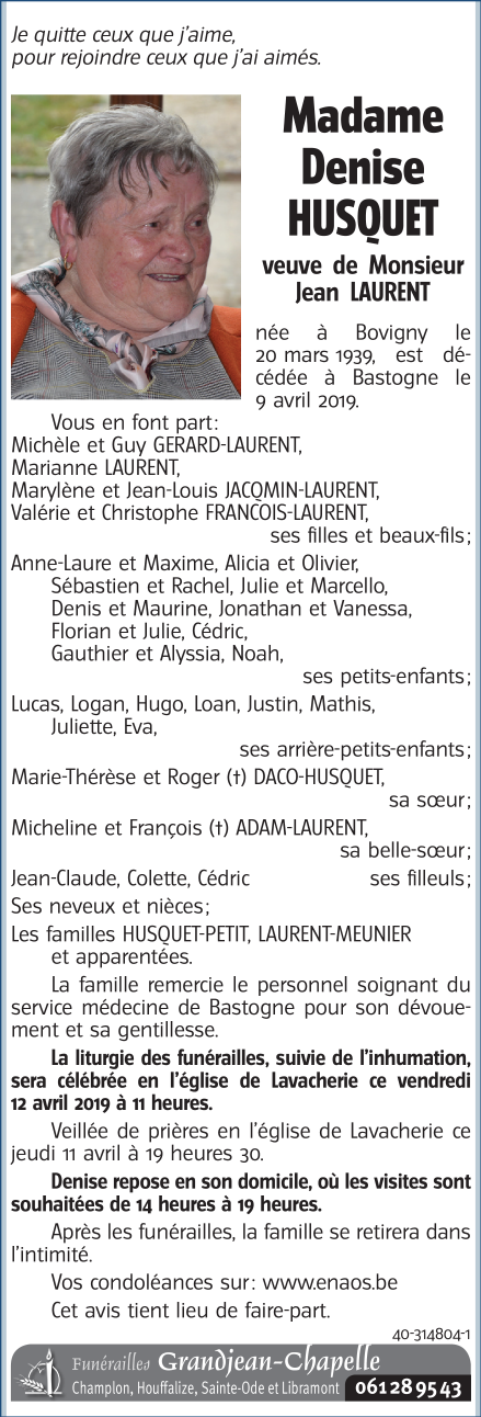 Décédée à Bastogne (6600) le mardi 9 avril 2019 à l'âge de 80 ans