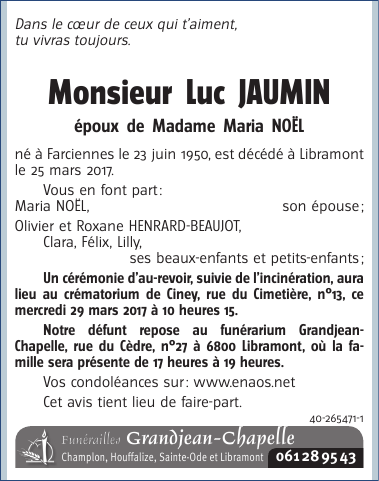 Décédé à Libramont (6800) le samedi 25 mars 2017 à l'âge de 66 ans