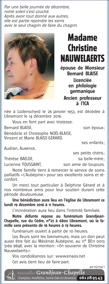 Décédée à Libramont (6800) le mercredi 14 décembre 2016 à l'âge de 63 ans