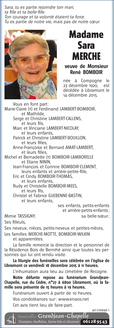 Décédée à Libramont (6800) le lundi 14 décembre 2015 à l'âge de 94 ans