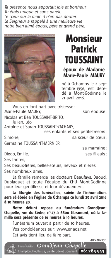 Décédé à Mont-Godinne (5530) le jeudi 21 avril 2016 à l'âge de 59 ans
