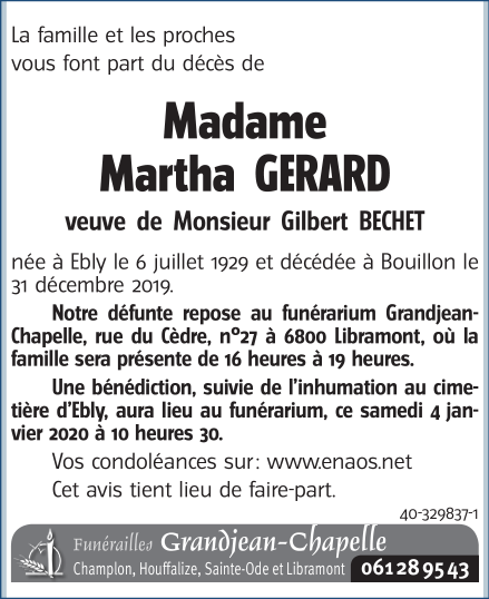Décédée à Bouillon (6830) le mardi 31 décembre 2019 à l'âge de 90 ans