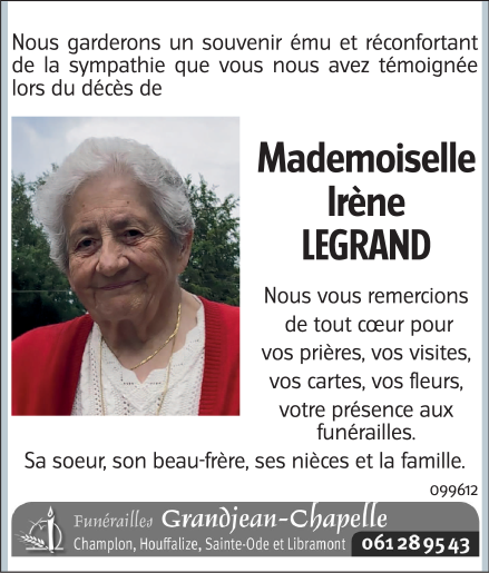 Décédée à Libramont (6800) le dimanche 28 décembre 2025 à l'âge de 89 ans