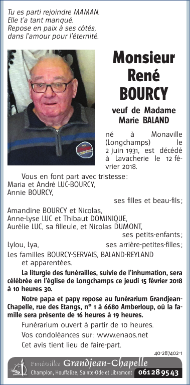 Décédé à Lavacherie (6681) le lundi 12 février 2018 à l'âge de 86 ans