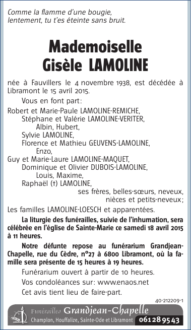 Décédée à Libramont (6800) le mercredi 15 avril 2015 à l'âge de 76 ans