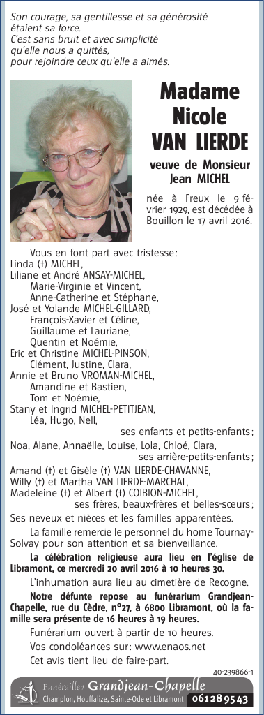 Décédée à Bouillon (6830) le dimanche 17 avril 2016 à l'âge de 87 ans