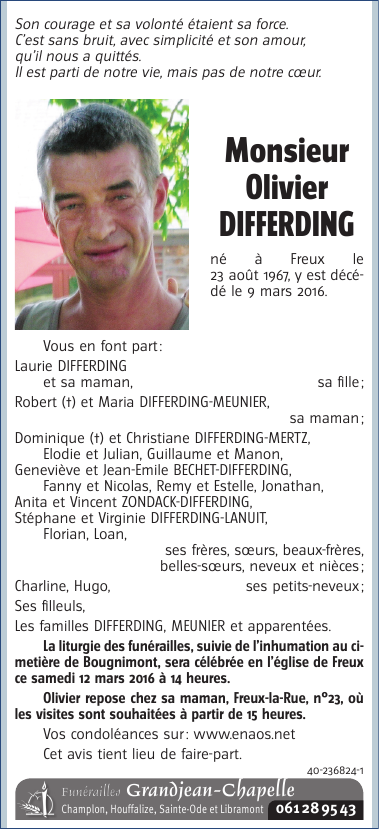 Décédé à Freux (6800) le mercredi 9 mars 2016 à l'âge de 48 ans