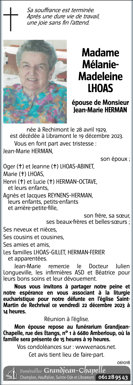 Décédée à Libramont (6800) le mardi 19 décembre 2023 à l'âge de 94 ans