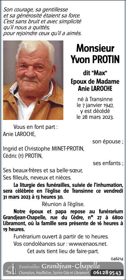 Décédé à Transinne (6890) le mardi 28 mars 2023 à l'âge de 76 ans