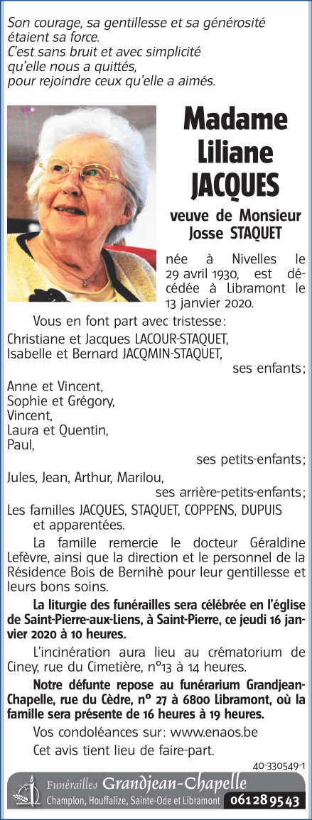 Décédée à Libramont (6800) le lundi 13 janvier 2020 à l'âge de 89 ans