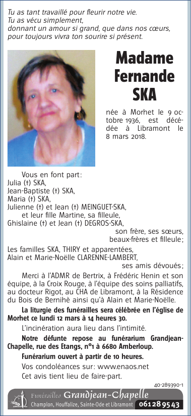 Décédée à Libramont (6800) le jeudi 8 mars 2018 à l'âge de 81 ans
