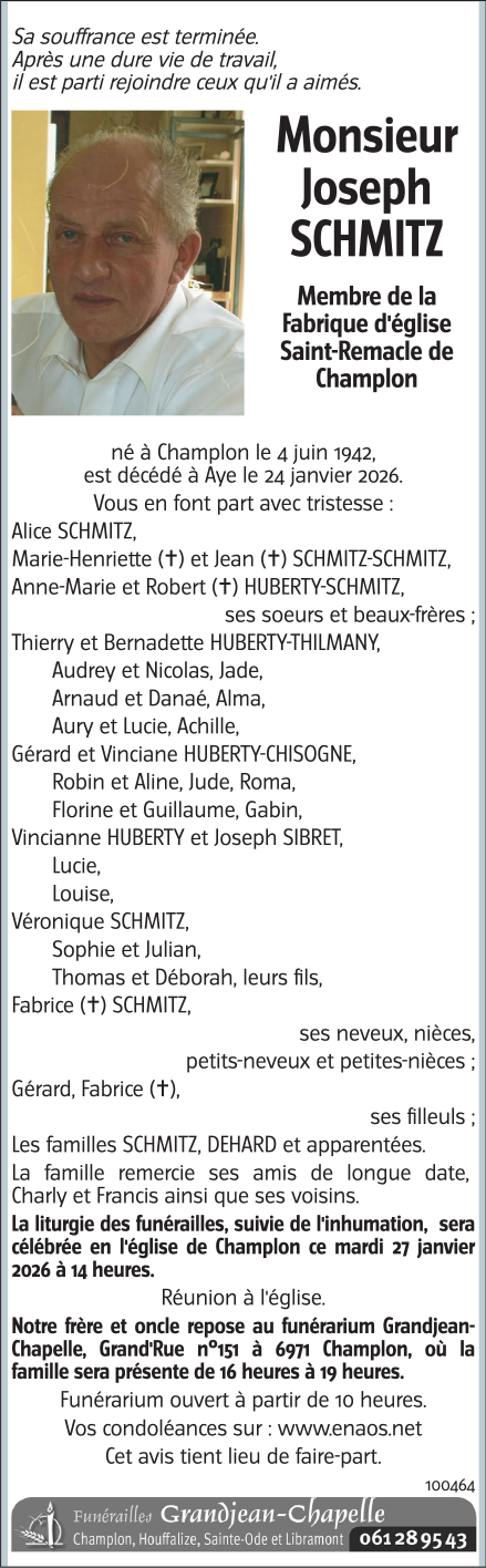 Décédé à Aye (6900) le samedi 24 janvier 2026 à l'âge de 83 ans
