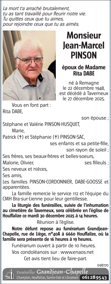 Décédé à Taverneux (6661) le samedi 27 décembre 2025 à l'âge de 77 ans