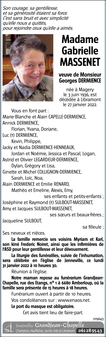 Décédée à Libramont (6800) le jeudi 27 janvier 2022 à l'âge de 85 ans