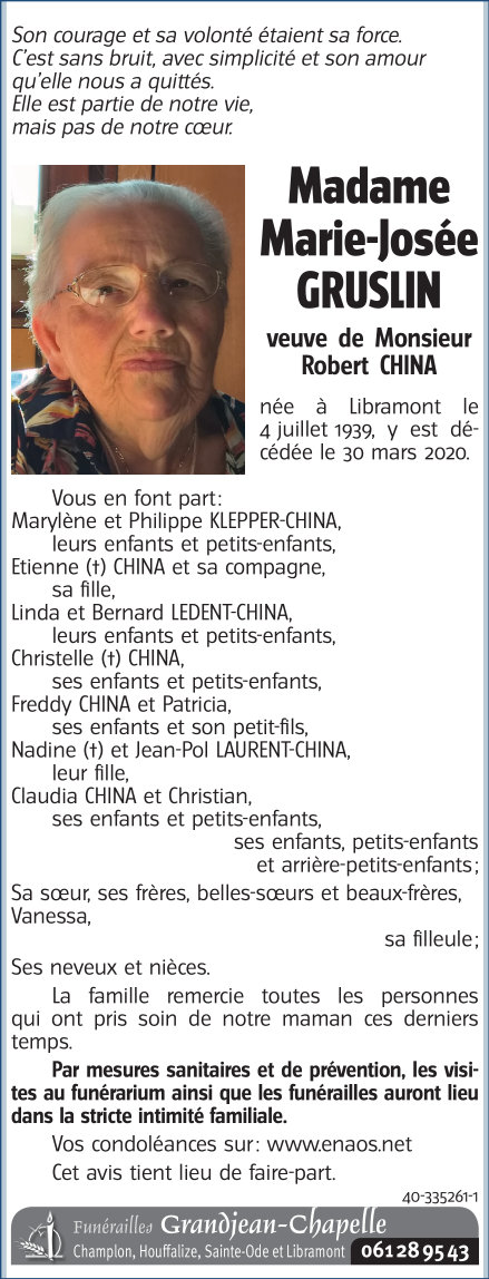 Décédée à Libramont (6800) le lundi 30 mars 2020 à l'âge de 80 ans
