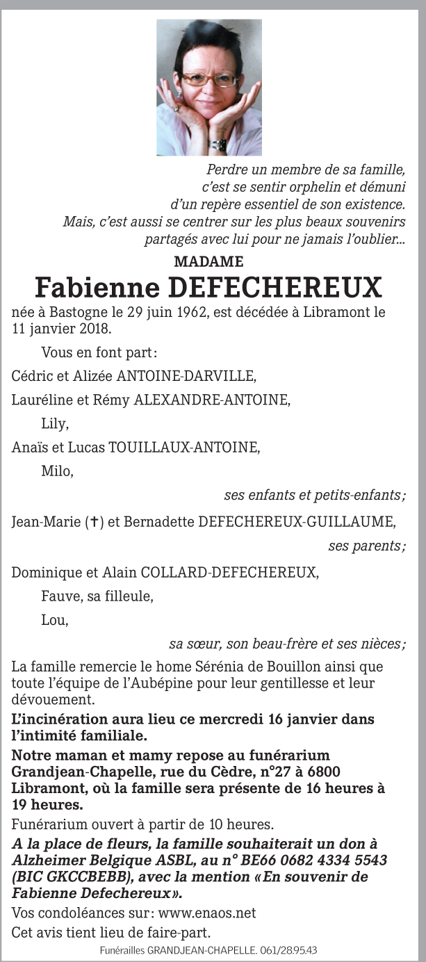 Décédée à Libramont (6800) le vendredi 11 janvier 2019 à l'âge de 56 ans