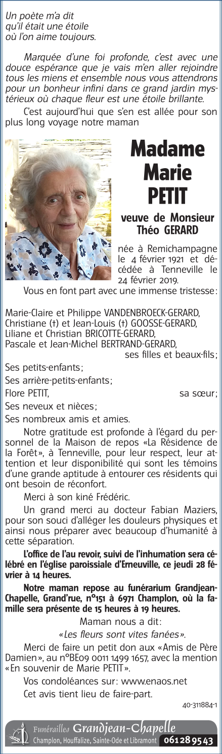 Décédée à Tenneville (6970) le dimanche 24 février 2019 à l'âge de 98 ans