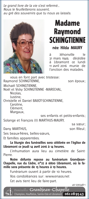 Décédée à Libramont (6800) le lundi 11 avril 2016 à l'âge de 67 ans