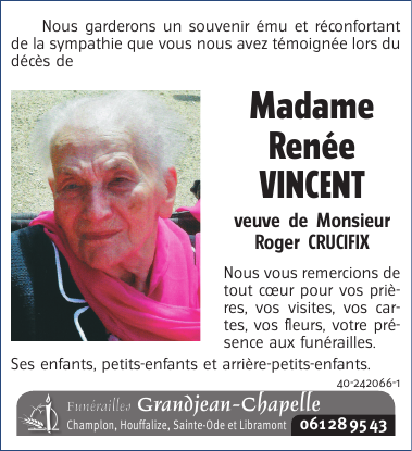 Décédée à Bertrix (6880) le vendredi 22 avril 2016 à l'âge de 91 ans