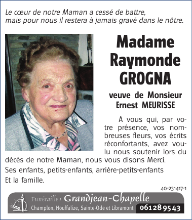 Décédée à Bastogne (6600) le mardi 8 décembre 2015 à l'âge de 85 ans
