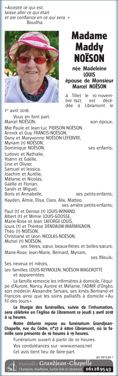 Décédée à Libramont (6800) le dimanche 1 avril 2018 à l'âge de 90 ans