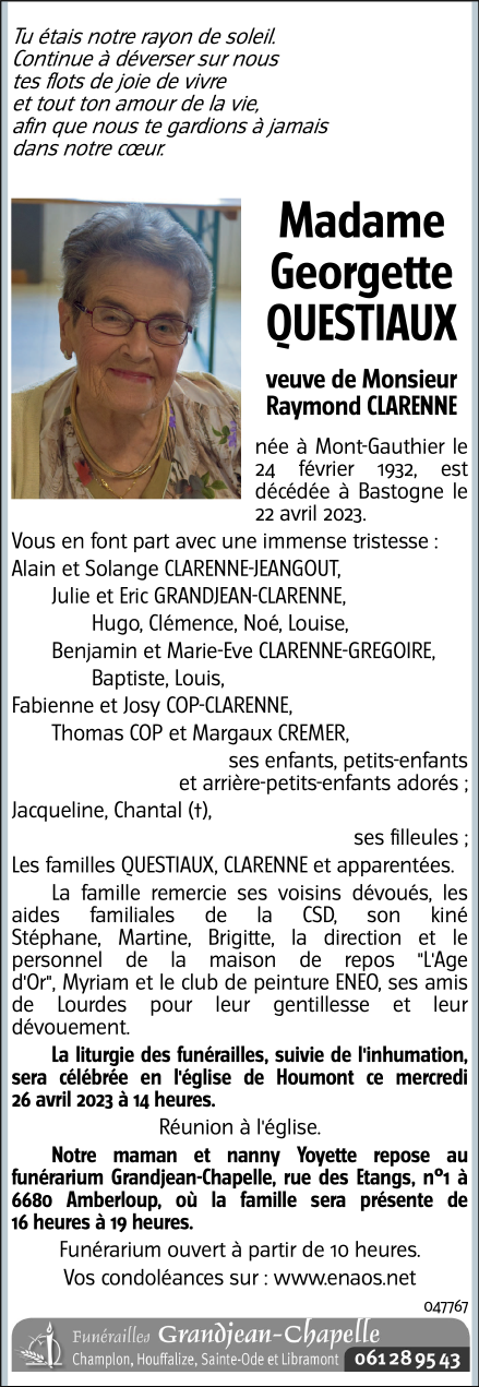 Décédée à Bastogne (6600) le samedi 22 avril 2023 à l'âge de 91 ans