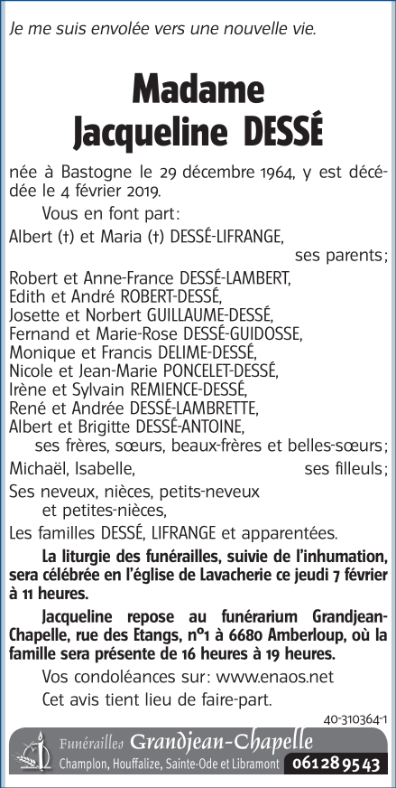 Décédée à Bastogne (6600) le lundi 4 février 2019 à l'âge de 54 ans