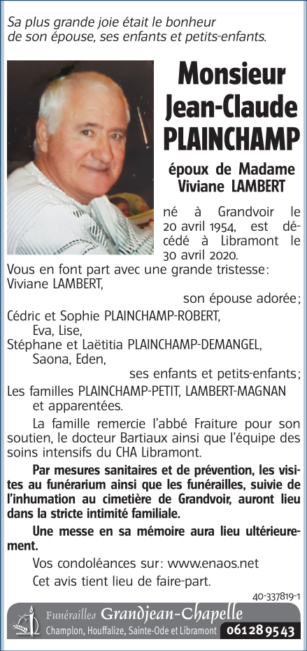 Décédé à Libramont (6800) le jeudi 30 avril 2020 à l'âge de 66 ans