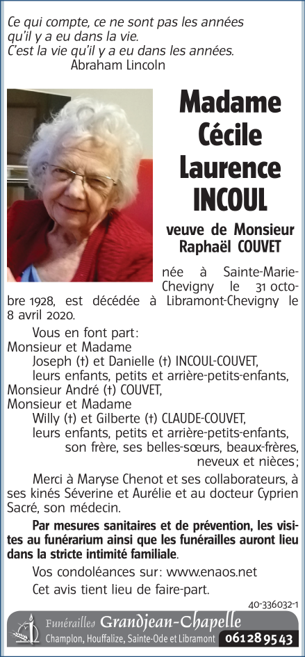 Décédée à Libramont (6800) le mercredi 8 avril 2020 à l'âge de 91 ans
