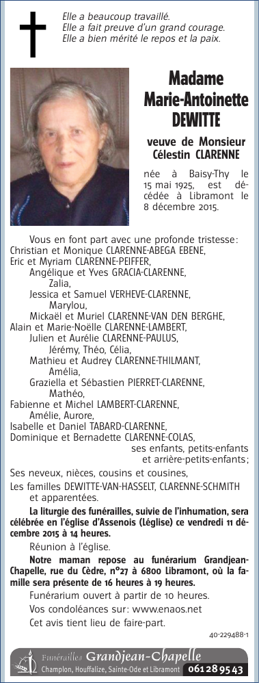 Décédée à Libramont (6800) le mardi 8 décembre 2015 à l'âge de 90 ans