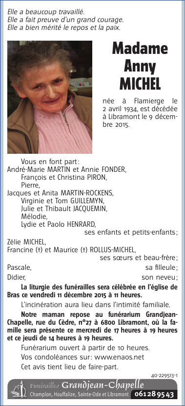 Décédée à Libramont (6800) le mercredi 9 décembre 2015 à l'âge de 81 ans