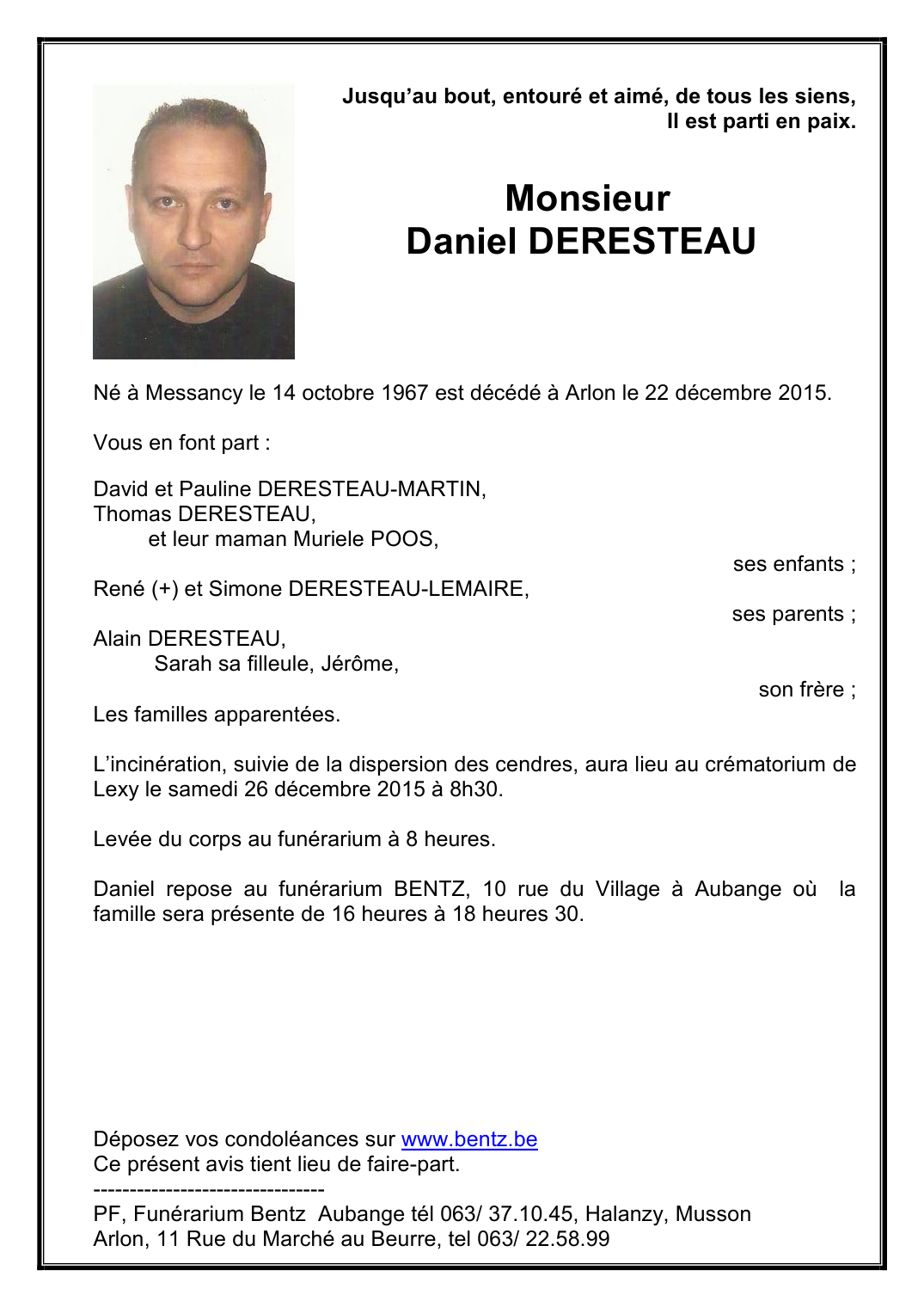 Décédé à Arlon (6700) le mardi 22 décembre 2015 à l'âge de 48 ans