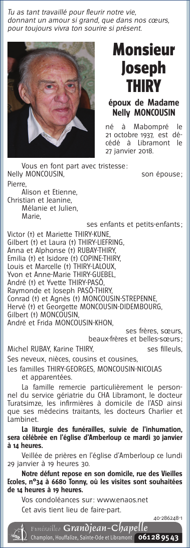 Décédé à Libramont (6800) le samedi 27 janvier 2018 à l'âge de 80 ans