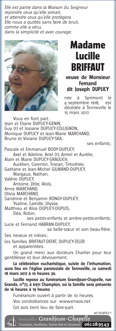 Décédée à Tenneville (6970) le mercredi 15 mars 2017 à l'âge de 98 ans