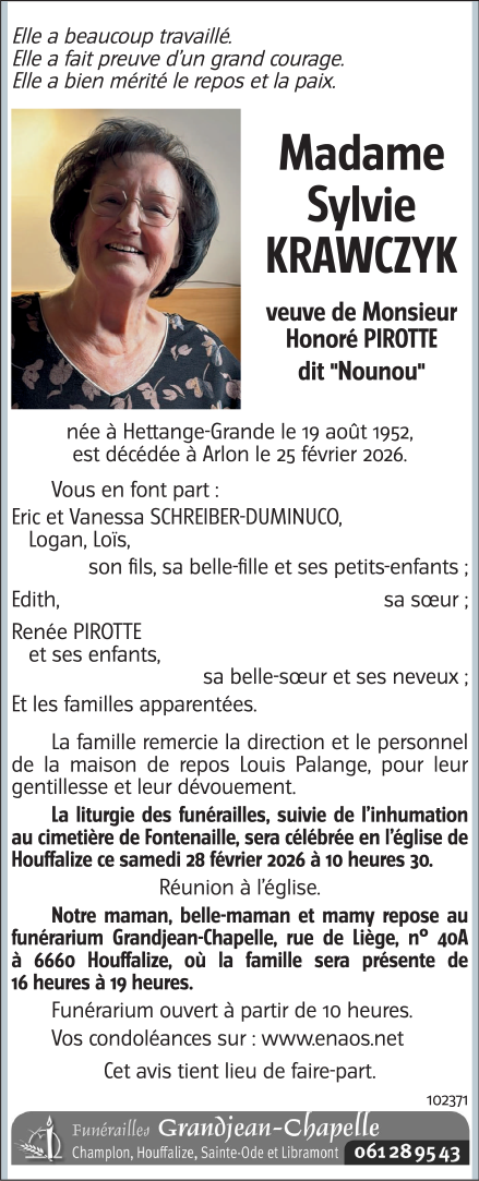 Décédée à Arlon (6700) le mercredi 25 février 2026 à l'âge de 73 ans