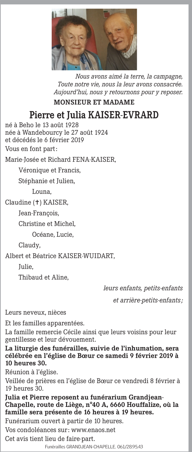 Monsieur et Madame Pierre et Julia KAISER-EVRARD