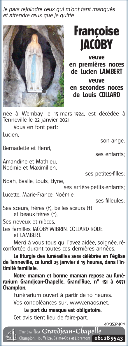 Décédée à Tenneville (6970) le vendredi 22 janvier 2021 à l'âge de 96 ans