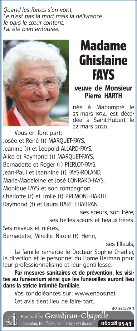Décédée à Saint-Hubert (6870) le dimanche 22 mars 2020 à l'âge de 85 ans