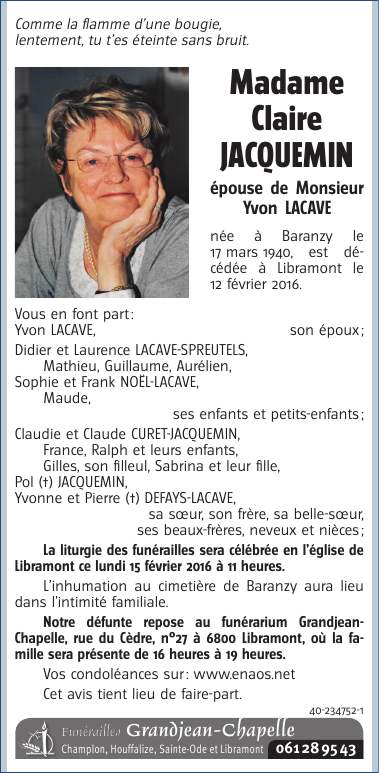 Décédée à Libramont (6800) le vendredi 12 février 2016 à l'âge de 75 ans